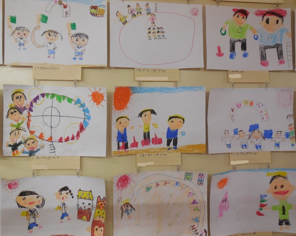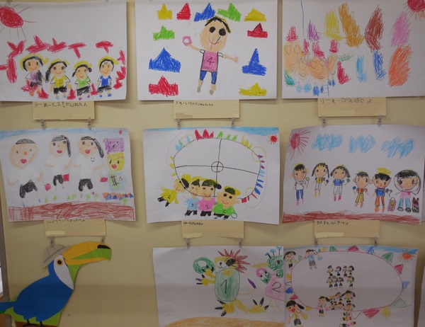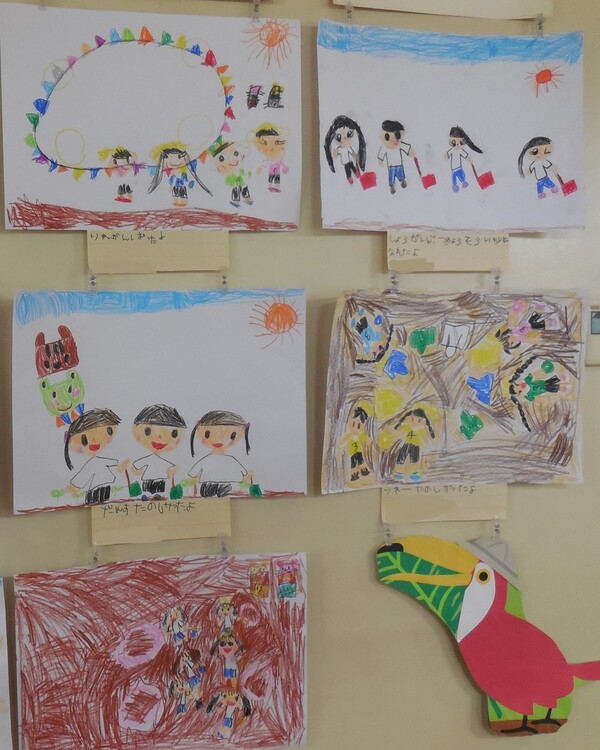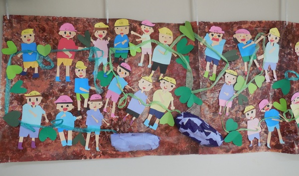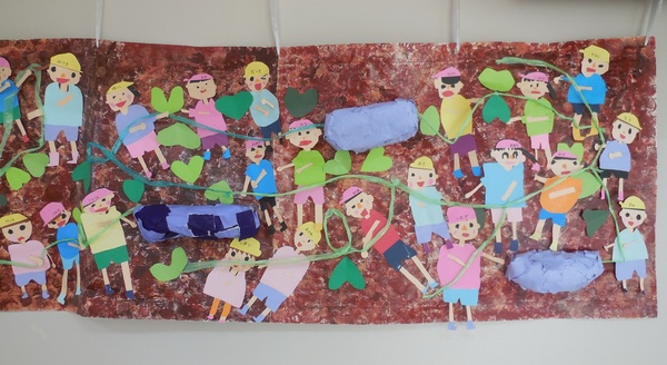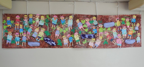 秋の作品 遊戯室に秋の作品が飾られています。秋の風物詩「運動会」と「芋ほり」です。運動会はまつ組さんの絵です。リレーやダンス、障害物競走、一つ一つの競技に一生懸命に取り組み、楽しかった子どもたちの姿が描かれています。芋ほりは、ふじ組さんとまつ組さんが協力して大きな壁画を完成させました。にこにこ笑顔の子どもたち、大きな大きなお芋、さつまいものつるなど芋ほりの楽しさが伝わってきます。お迎えの時にじっくり見てくださいね。 2025/10/17