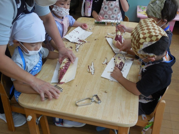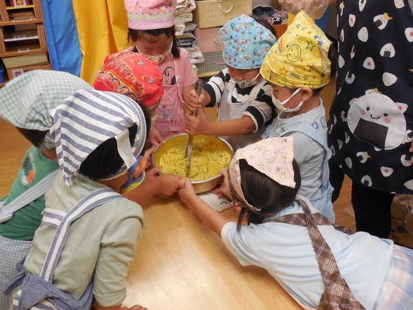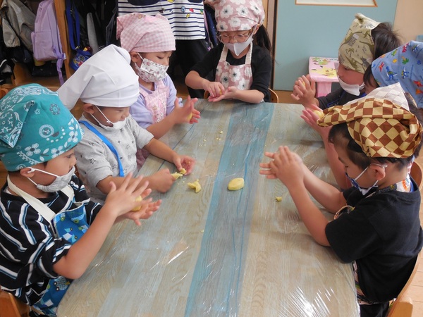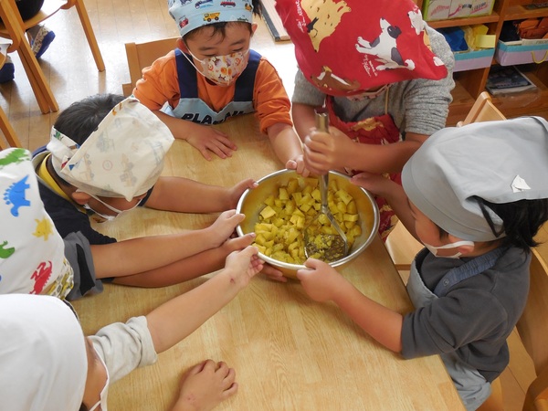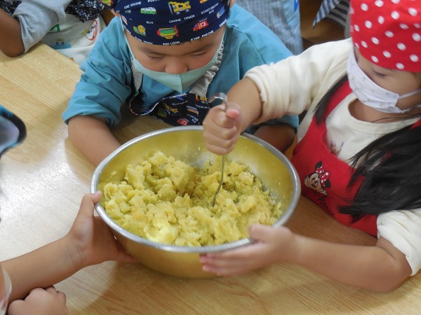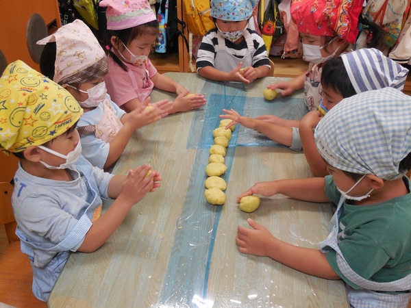 スイートポテトづくり 「今日はスイートポテトづくり!」と朝からウキウキのうめ組さん。身支度を整えていよいよクッキング開始。ピーラーで皮をむき、さつまいもを切って蒸し器で蒸しました。蒸しあがったお芋を見ながら「色変わったよ」「いいにおいだあ」「おいしそう」と嬉しそうな子どもたち。一口味見をしたあと、みんなで協力して潰し、砂糖やバター、生クリームを入れてよく混ぜました。最後にみんなで一個一個まるめました。あとはオーブンで焼いて〜。「早く食べたいなあ」と3時のおやつが待ち遠しい子どもたちです。 2025/10/22