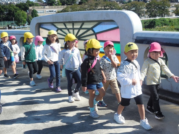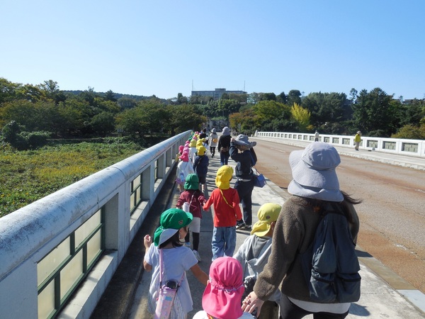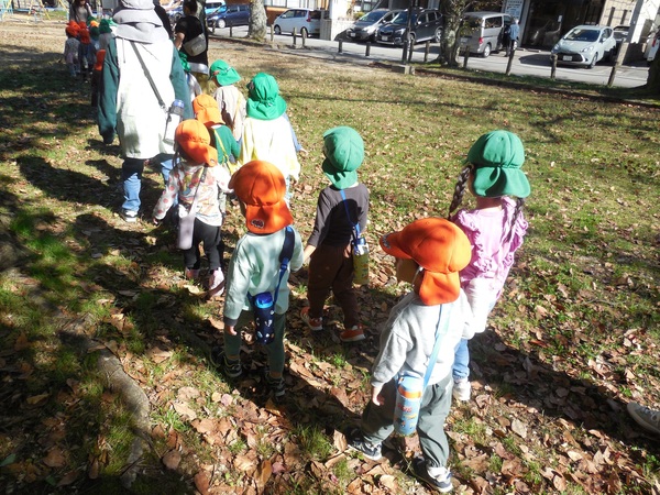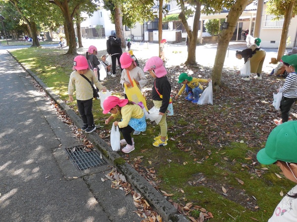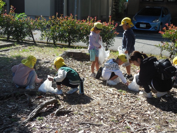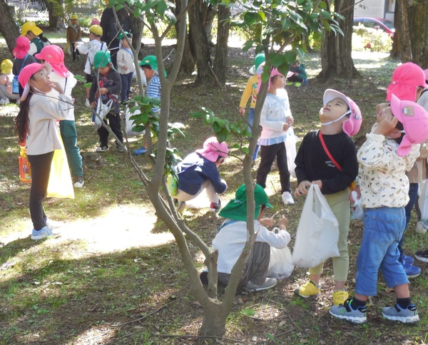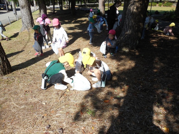 どんぐり拾い うめ組ふじ組まつ組の3クラスで犀川緑地公園にどんぐり拾いに出かけました。うめ組さんの遠出は初めてでしたが、お兄さんお姉さんに手を引かれ元気に行ってきました。公園では、「大きいのあったよ」「帽子つきのどんぐりだあ」「まつぼっくりもあるよ」とお気に入りのどんぐりやまつぼっくりを拾っていました。中には、いっぱいになった袋の中を見せながら、「お父さんお母さん喜ぶね」とうれしそうに言っていました。秋晴れの好天のもと、楽しくほんのり温かいいい時間を過ごしました。 2025/10/23