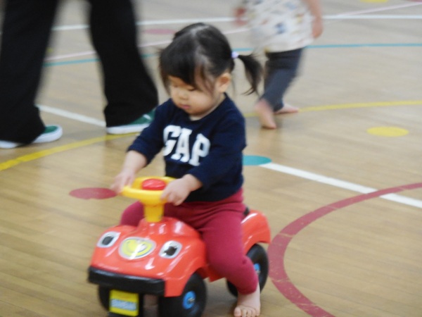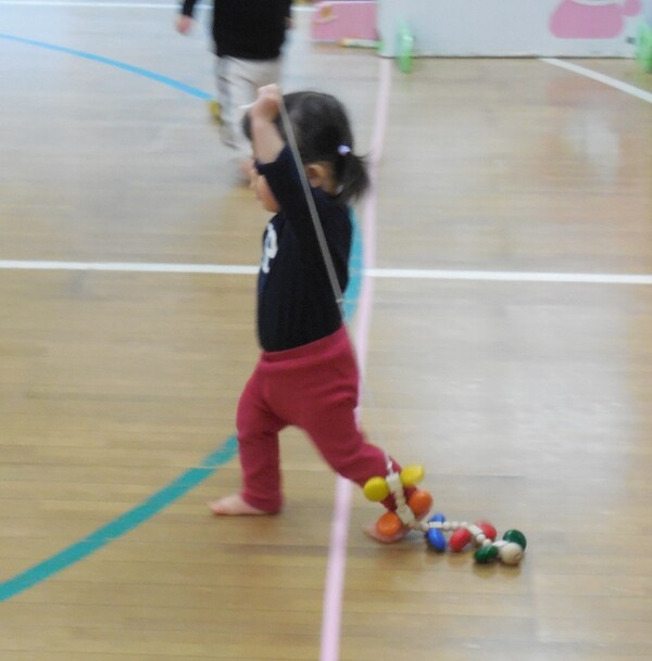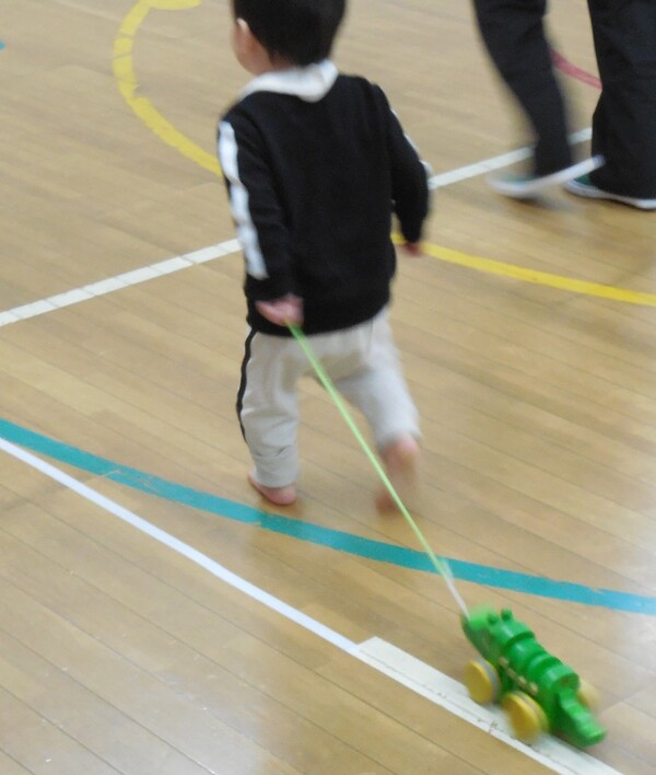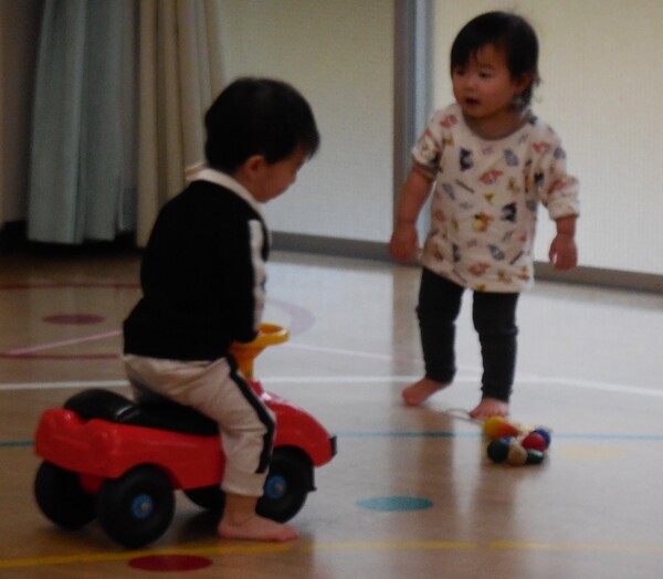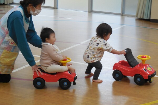 遊戯室でお出かけ ひよこ組さん、遊戯室でお出かけごっこ。カタカタと音のなる動物さんをひいてお散歩へ。音が鳴るのが楽しくて小走りになったりゆっくり歩いたりと、とっても楽しそう。車にも乗ってお出かけへ。足を上手に動かし前に進んだり方向を変えたりと、立派なちびっ子運転手さんでした。 2025/12/03