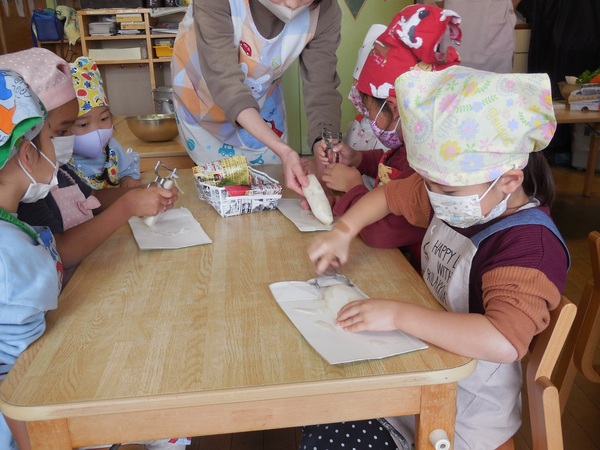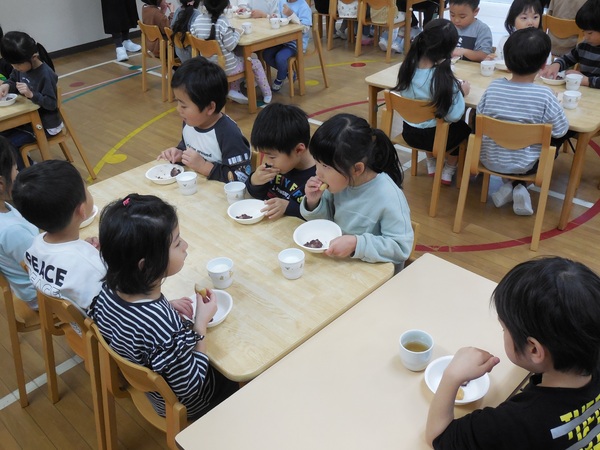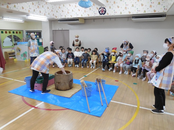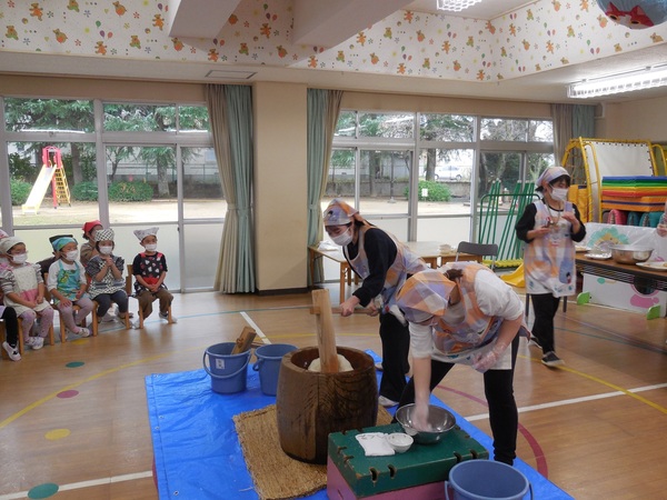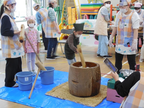 お餅つき 「ぺったん、ぺったん」の大合唱とともに毎年恒例のお餅つきがスタート。「よいしょ、よいしょ」の元気なかけ声の中、先生方、まつ組さんが重い杵を持ち上げ、「おいしくなあれ」と思いを込めてつきました。3時のおやつはつきたてのお餅。きな粉餅、あんこ餅、あべかわ餅。子どもたちは、よく噛んで美味しいお餅を味わいました。みんなでするお餅つきは、手間がかかりますが、それ以上の楽しさと喜びがありますね。給食先生、先生方、準備等ありがとうございました。 2025/12/04