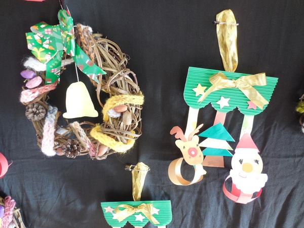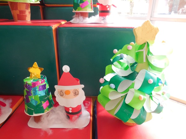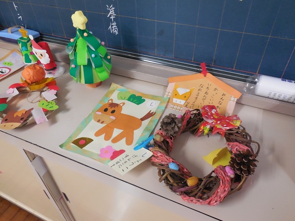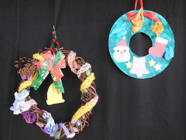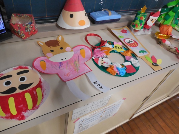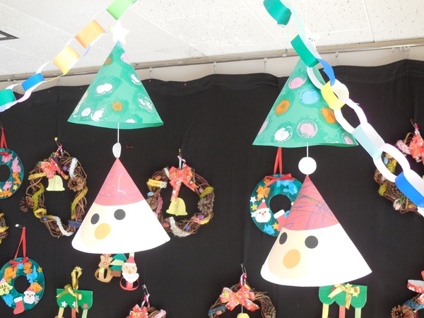 クリスマス飾り わくなみこども園全園児のクリスマス製作が飾られました。リースやツリー、サンタクロースやトナカイ。指先もどんどん器用になり、はさみやのり、クレヨン、絵の具などを上手に使い楽しく製作しました。みんなの作品をサンタさんも見に来てくれるかな。今度のクリスマス誕生会が楽しみですね♪ 2025/12/17