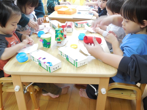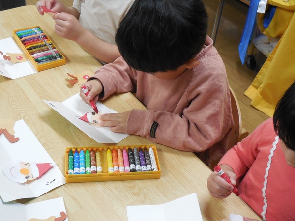 クリスマス製作 クリスマス製作進行中。のりを使って色紙を貼ったり、クレヨンでお鼻やお口を書いたり、ハサミを使って切るなど、楽しく集中して製作に取り組んでいます。のりやクレヨン、はさみの使い方も、どんどん上達してきていますね。完成したら、遊戯室に飾ります。皆さん是非ご覧ください。 2025/12/12