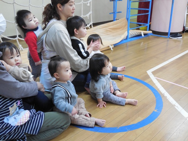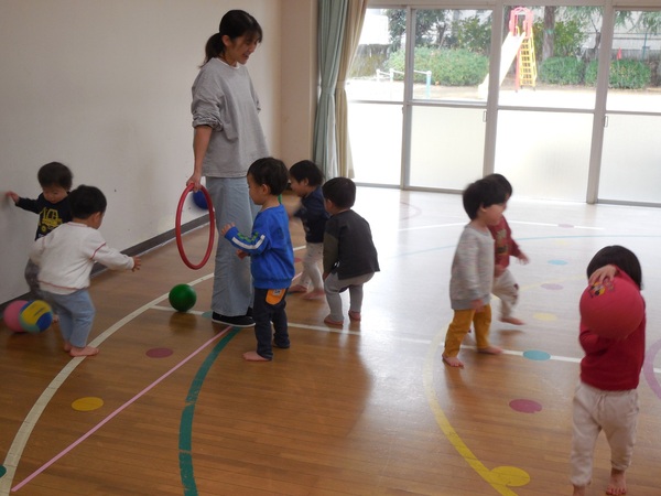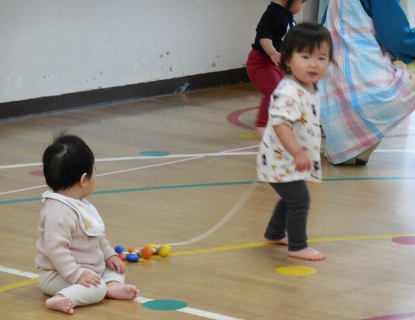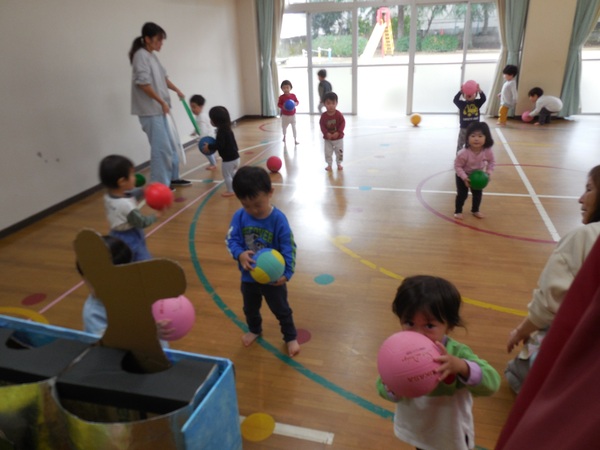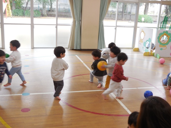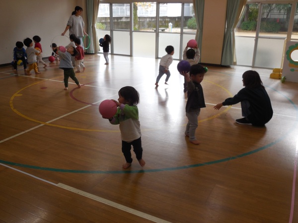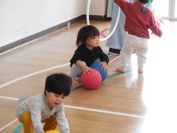 ボール遊び うさぎ組さんは広い遊戯室でのボール遊び。ひとり1個、大きなボールを持ちながら、無邪気に遊ぶ子どもたち。大事そうに抱えて走ったり、転がしたりする子。輪っかに入れたり、足に挟んだり。上手にボールと遊んでいる子もいれば、遊ばれている子も。経験初期の子どもたちの姿はとっても可愛いですね。 2025/12/12
