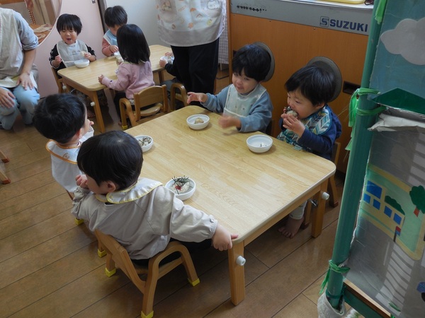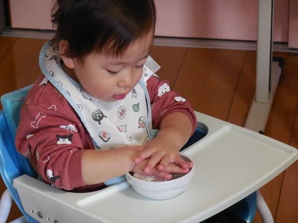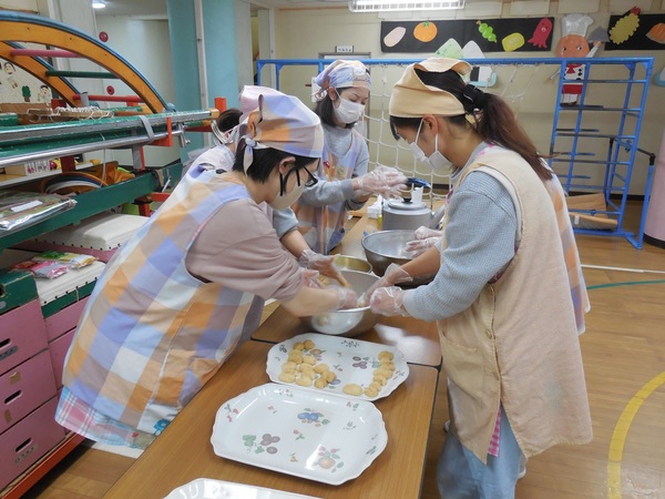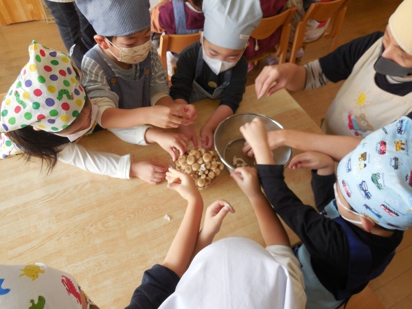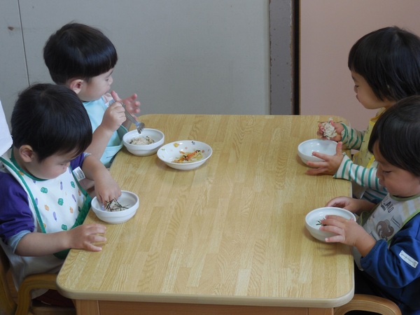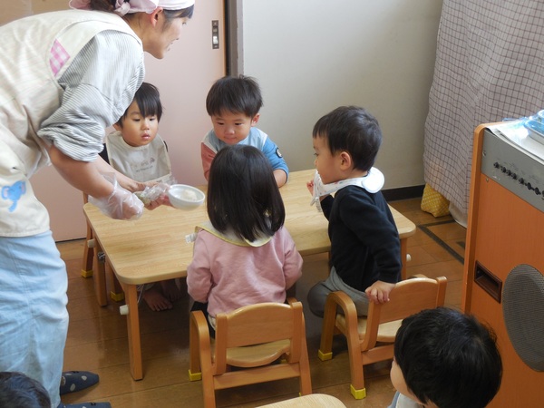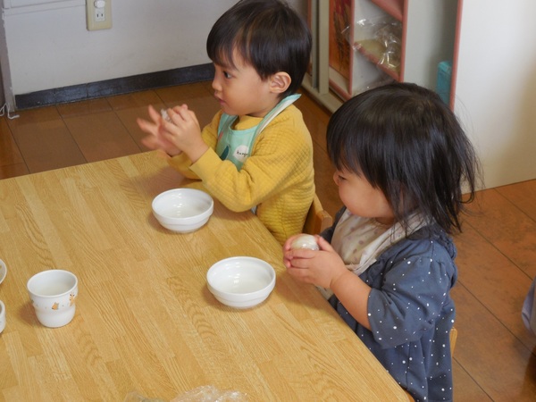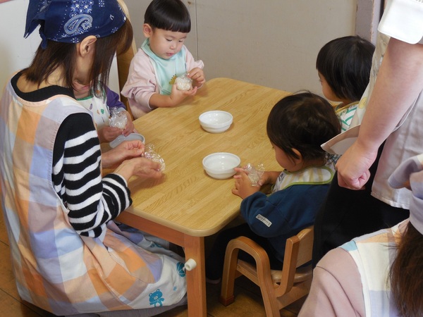 おにぎりクッキング うさぎ組さんのクッキングはおにぎりづくり。中に具材を入れてにぎにぎ開始。「ぎゅっぎゅっ、にぎにぎ、ぺたぺた」楽しそうににぎり、あっという間におにぎりの出来上がり。早速大きな口を開けてまるっぽい形のおにぎりをおいしそうにほおばっていました。 2025/12/16
