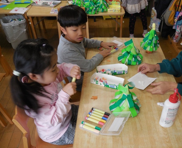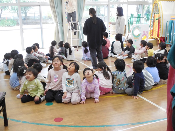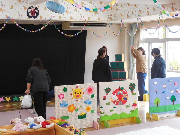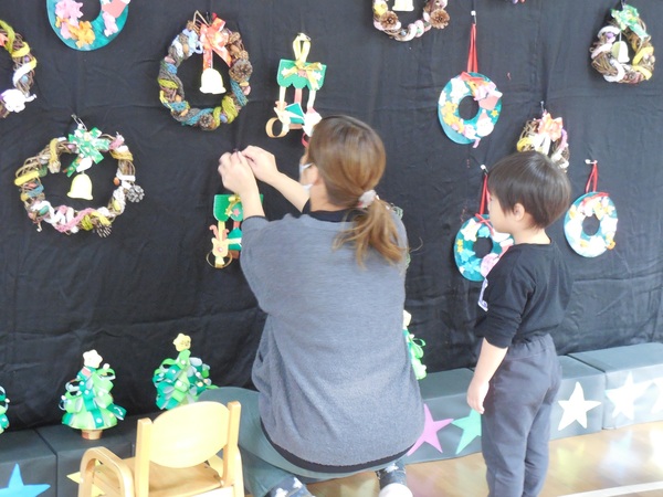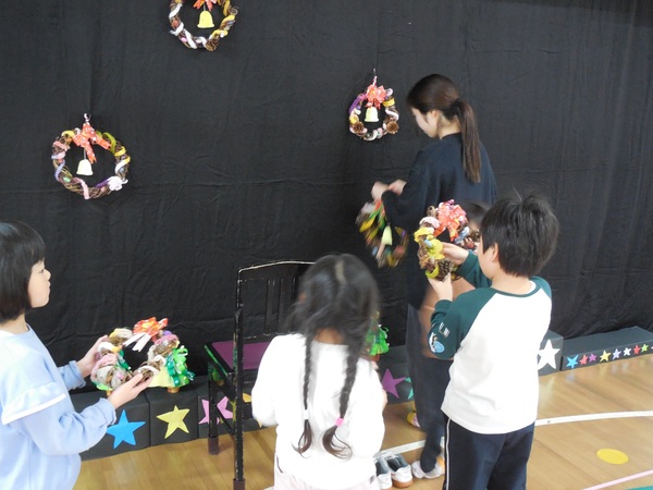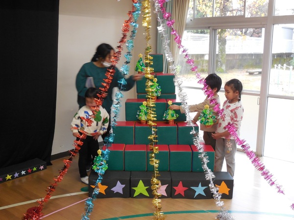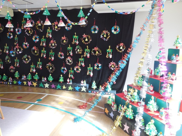 クリスマス飾りつけ 今日はクリスマス飾りつけの日。午前中は、子どもたちが作った長〜い輪っかの飾りつけ。クリスマスソングが流れる中、ニコニコ楽しそうに見守る子どもたち。午後からは、先生方も笑顔で会場準備。最後に子どもたちの自慢の作品を飾ってクリスマスを迎える準備は完了。保護者の皆さん、お迎えの時、すてきな子どもたちの作品をゆっくり見学してくださいね。 2025/12/16