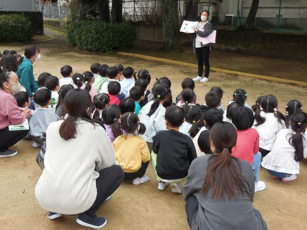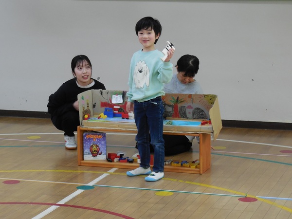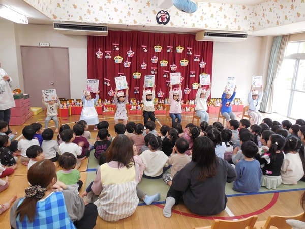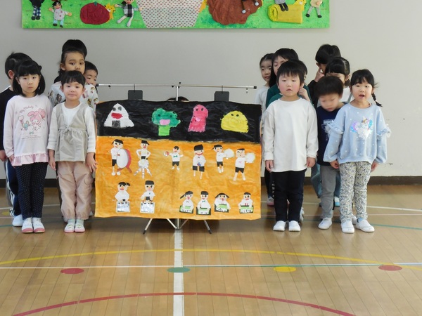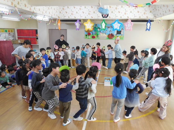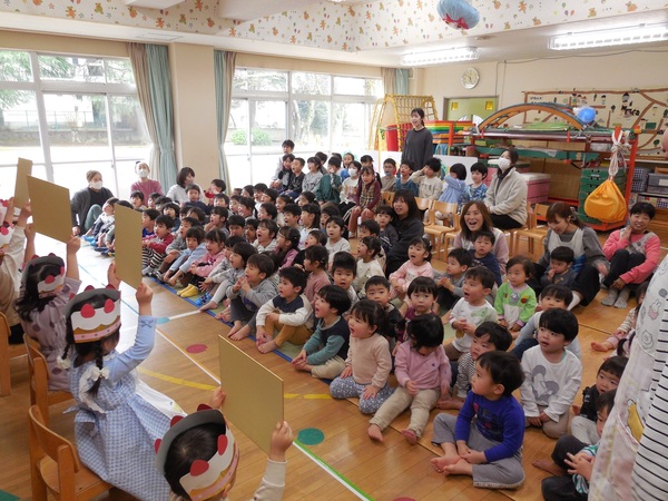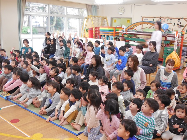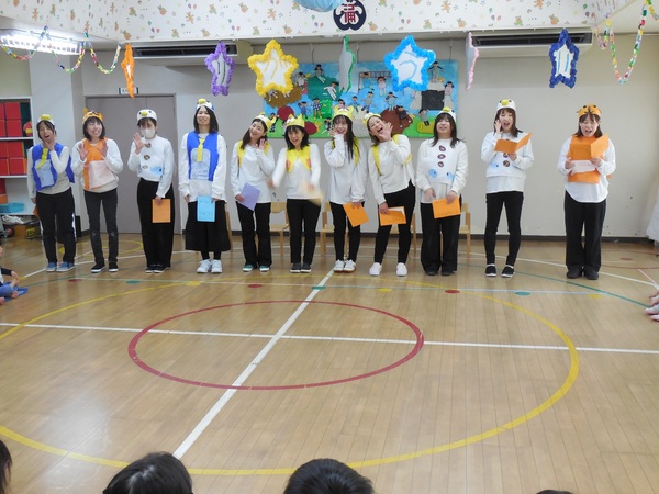 ありがとう会 まつ組さんとお別れする「ありがとう会」が行われ、どの組もまつ組さんに感謝の気持ちを伝えていました。中にはまつ組さんと一緒にダンスし、最後にギュッとハグするクラスも。ふじ組さんは、練習の成果を発揮し、司会進行や思い出紙芝居を立派にやり終え、会を大成功へと導きました。先生方のユーモアたっぷりの劇もみんなの心を温めてくれました。とっても楽しく心のこもった会となりました。 2026/03/06