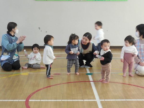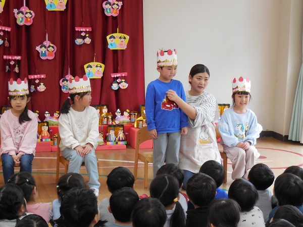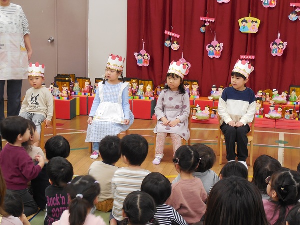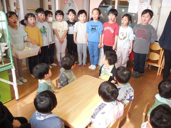 ひな祭り誕生会 今日は、ひな祭り誕生会。8人のお友だちの誕生日をみんなでお祝いしました。ドキドキしながらも元気にインタビューに答える子、にこにこ笑顔で色紙をながめている子、先生におんぶされ嬉しそうな子、心をこめて歌うわくなみっ子‥‥今年度最後の誕生会もとってもあたたかい会となりました。お昼はわくなみレストランで美味しいちらしずしをいただきました。給食先生、いつもありがとうございます。 2026/03/03