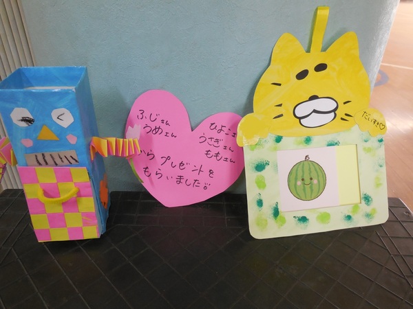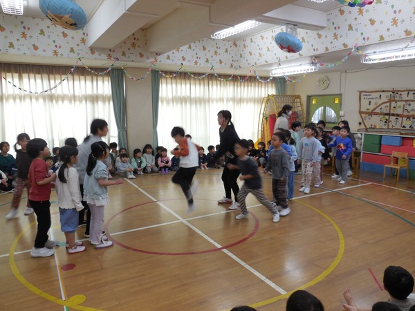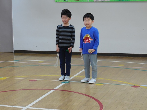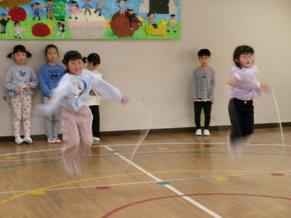 ありがとう会パート2 まつ組さんは、けん玉やコマまわし、なわとびやとび箱など自分の得意技を披露しました。最後に、みんなで8の字とびにチャレンジ。172回と大幅に最高記録を更新。さすが、チームワークよく何事にもあきらめず、一生懸命取り組むまつ組さんの力を見せました。その他、まつ組さんの卒園製作のお披露目や在園児からのプレゼント渡しも行われました。遊戯室に展示してありますので、お迎えの時などぜひ見学してください。 2026/03/06