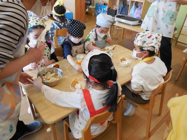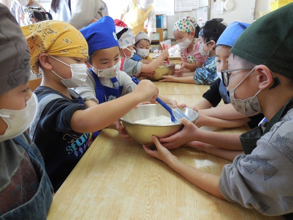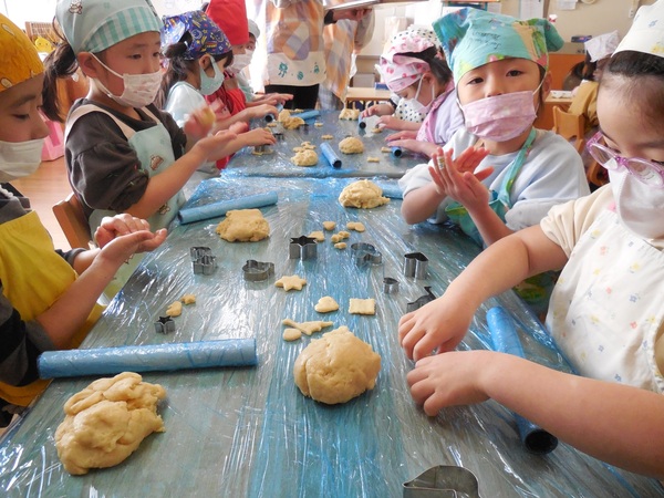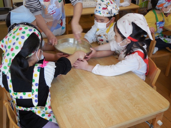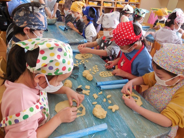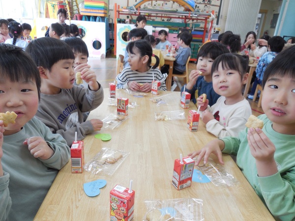 おやつ会 今日は、まつ組最後のクッキング。ありがとう会の感謝の気持ちをこめてのクッキーづくり。園児と職員、全員分を作りました。ボールに材料を入れて「おいしくなあれ」とぐるぐるかき混ぜ、グッグッとこねながら生地を作り、最後は、楽しそうに型抜きし、オーブンで焼きました。出来上がったクッキーは一人ひとり袋に入れ全園児、職員に配りました。とても手際がよくクッキー屋さんのようなまつ組さん。もらった園児もまつ組さんもとびっきりの笑顔でおいしくいただきました。まつ組さん、ありがとうございました。 2026/03/09