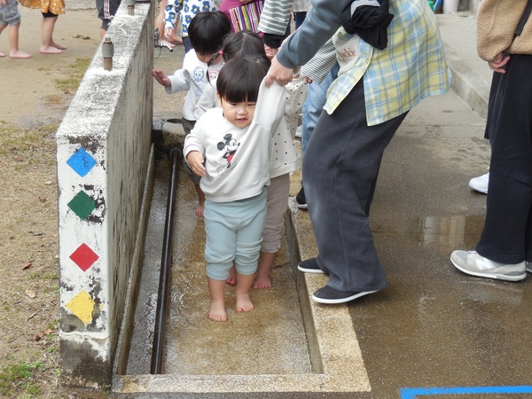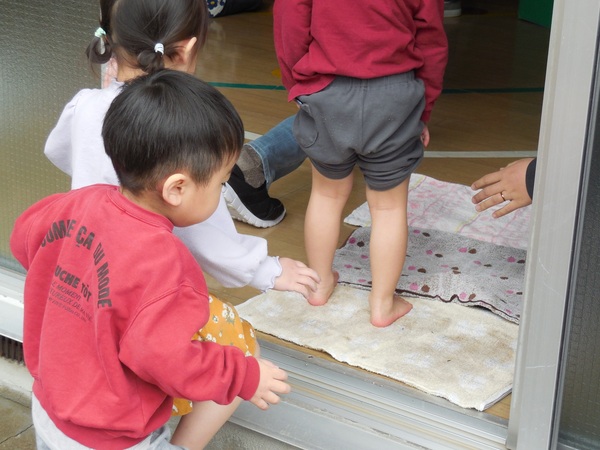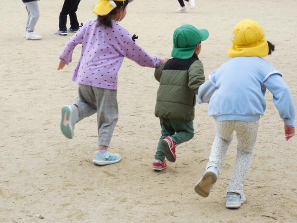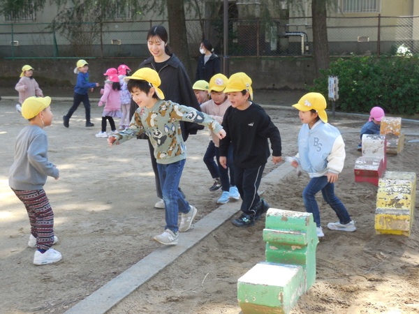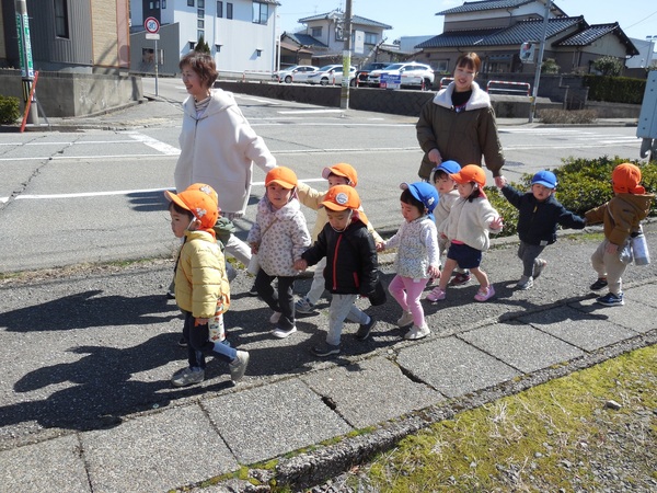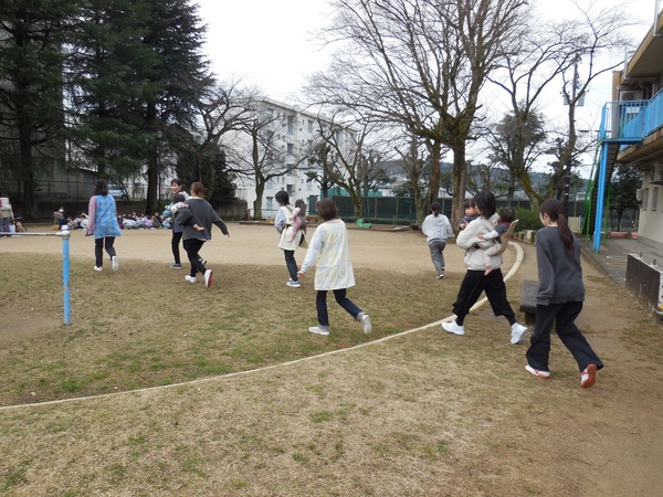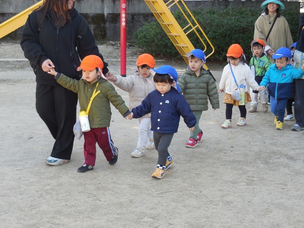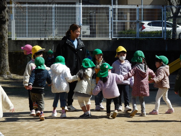 お外大好き! 吹く風はひんやりでしたが、とっても良いお天気。元気いっぱいのわくなみっ子は、全クラス、大好きなお外へ。ちょっぴりお兄ちゃんお姉ちゃんになったもも組さんは、うさぎ組さんと手をつないでお散歩に。最後まで手を離さずゴールしたよ。公園では、鬼ごっこや花いちもんめなどのびのびと笑顔いっぱいで遊んでいました。 2026/03/11