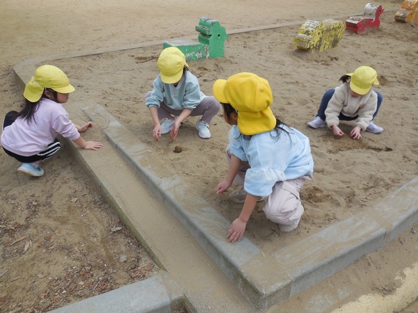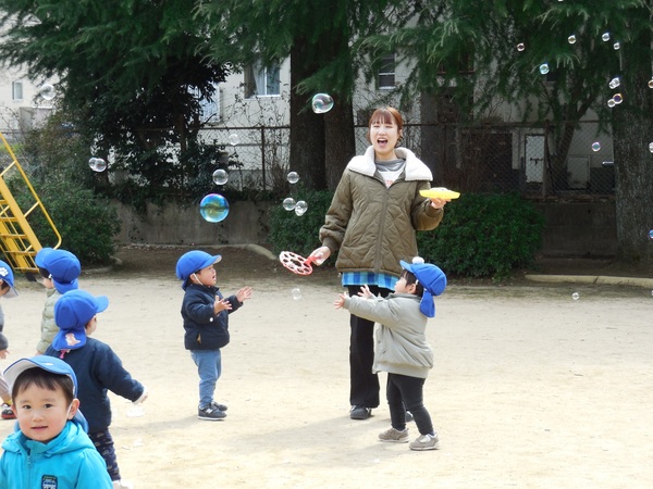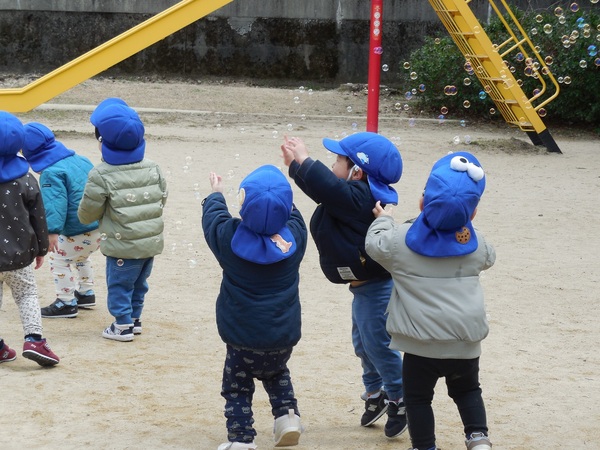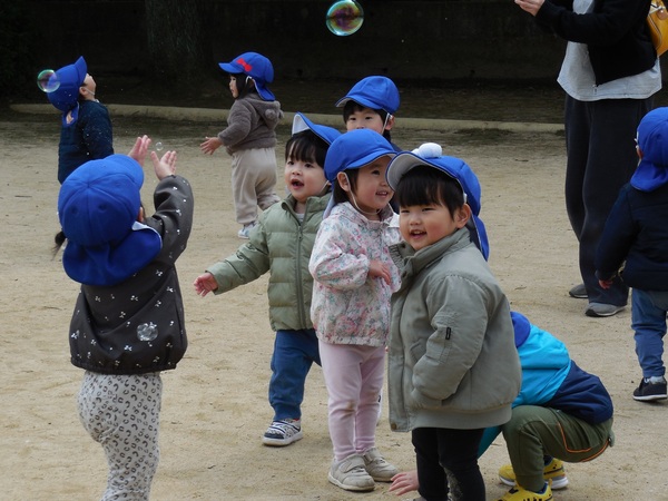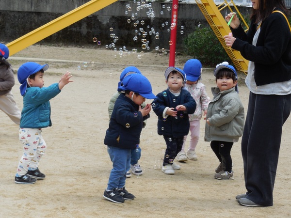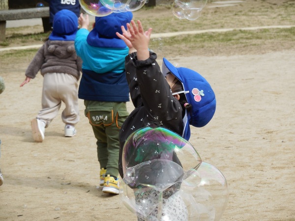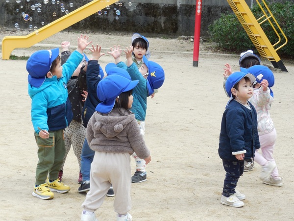 シャボン玉遊び 今日も穏やかな日。うさぎ組さんは公園でシャボン玉あそび。「わあ、きれい。大きいよ。」と大喜びでシャボン玉を追いかけたり、触ってみようと手を伸ばしたり、笑顔いっぱいの子どもたちでした。 2026/03/18