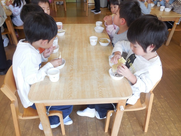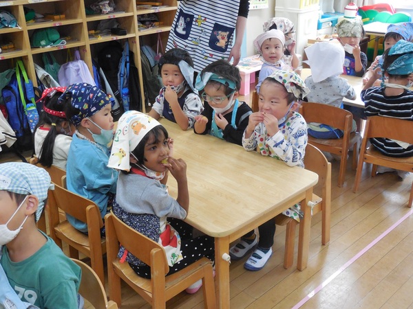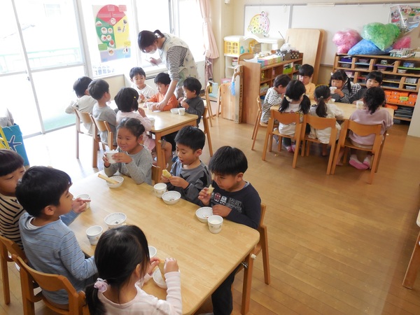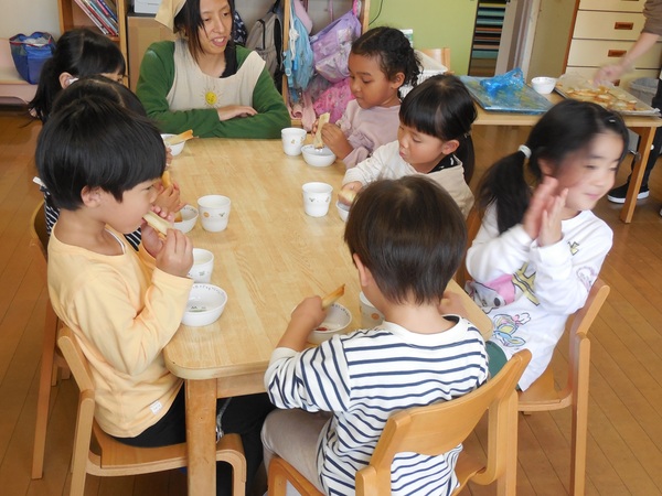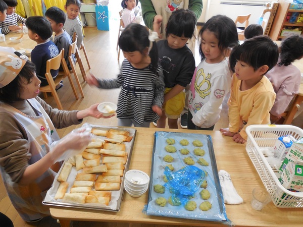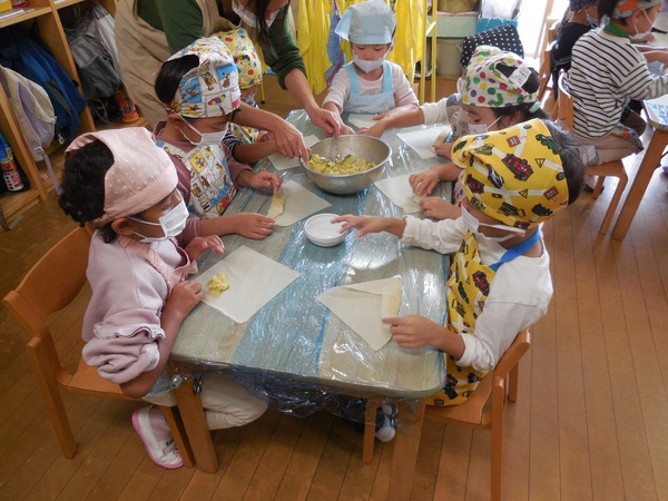 さつまいもパイづくり さつまいもごはんやさつまいも餃子など収穫したさつまいもを楽しく調理しおいしく食べています。今回は、ふじ組さんの「さつまいもパイ」作り。ふかしたさつまいもを協力して潰し、砂糖やバターを入れて、春巻きの皮でくるくる巻きました。大きさはまちまちですが、上手に巻けました。あとは、オーブンで焼いて〜。甘くおいしいにおいとともにさつまいもパイの出来上がり。ニコニコほおばりながら、みんなでおいしくいただきました。 2025/10/29