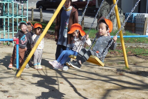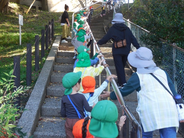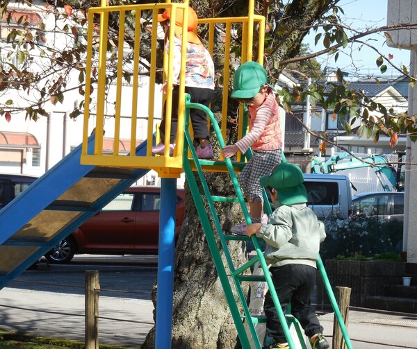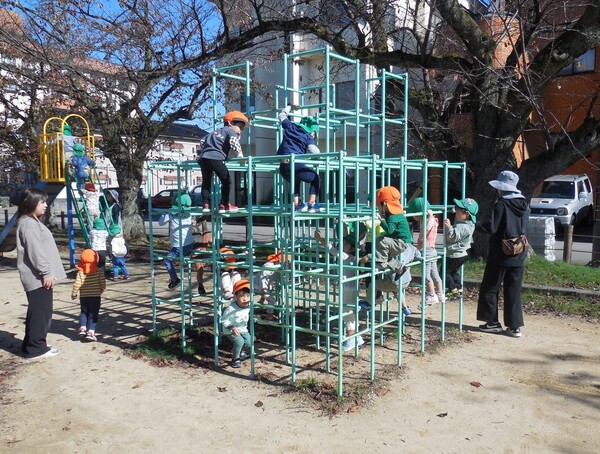 花里公園にレッツゴー! 今日は穏やかなお散歩日和。うめ組さんともも組さんは一緒に花里公園にお散歩に出かけました。ちょっぴり遠回りをして最後は長い長い階段を上って公園に到着。ジャングルジムやブランコなどお気に入りの遊具でいっぱい遊びました。 2025/10/30