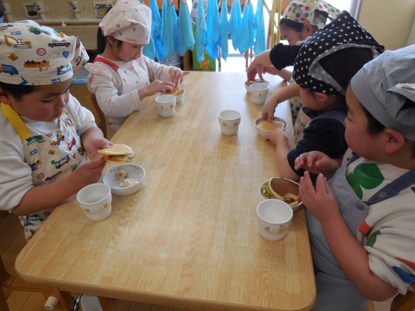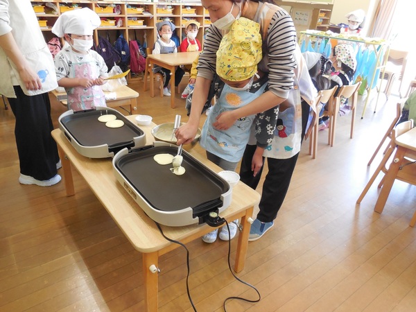 ホットケーキサンドづくり ふじ組さん最後のクッキングはホットケーキサンドづくり。生地を混ぜながら、「おいしそう、クリームみたい」と喜び、焼く時は、熱いプレートに気をつけ、おそるおそる生地を入れ裏返す子どもたち。大好きなクリームや好きなくだもの等をのせ出来上がり。「甘くておいしい」と嬉しそうにほおばっていました。 2026/03/12