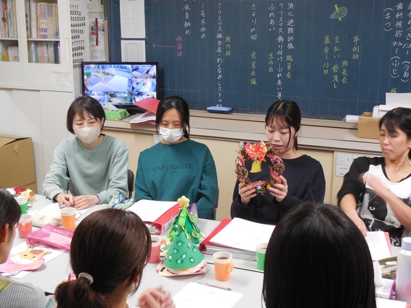 クリスマス製作・お正月製作 12月の事例研究会。クリスマス製作・お正月製作の先生手作りの見本を持ち寄り、色合いや作り方、見栄え等について話し合いました。今年もステキな思い出の製作になりそうです。楽しみにしていてくださいね。 2025/12/08