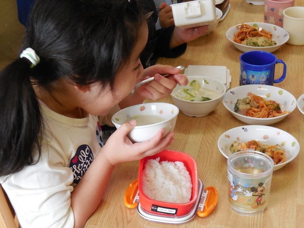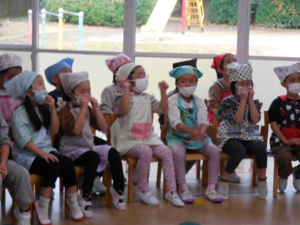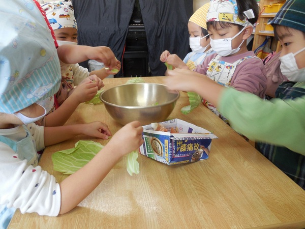 大根シチューつくり 晩秋から冬へと、公園の落葉樹も残すはアメリカ楓の葉っぱのみ。寒い日にはあったかいシチューが一番。今日はふじ組さんがわくなみっ子菜園でとれた大根を使ってシチューをつくりました。みんなで協力して大根の皮むきやきのこのふさ分けなど材料の準備。大きなお鍋においしい野菜をいっぱい入れ「ぐつぐつ」煮込んであったかいシチューの出来上がり。ふうふうしながらおいしくいただきました。 2025/12/09