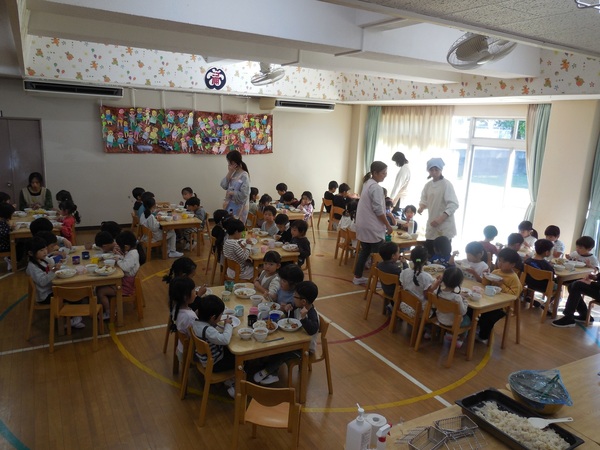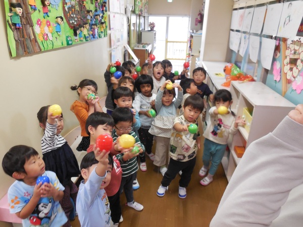 10月の誕生会 10月生まれの誕生会がありました。10月生まれのお友だちは9人です。あたたかい雰囲気の中、みんなにお祝いしてもらい、先生の愛情たっぷりの手書きの色紙をもらい、にこにこととっても嬉しそうでした。お誕生日おめでとうございます。お昼はわくなみレストラン。秋の味覚の栗ご飯をみんなでおいしくいただきました。給食先生、いつもありがとうございます。ごちそうさまでした。 2025/10/24