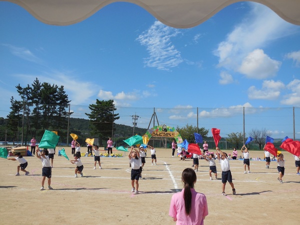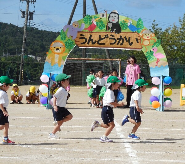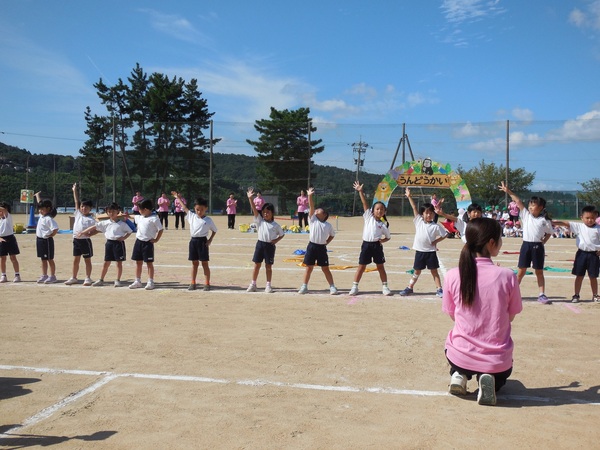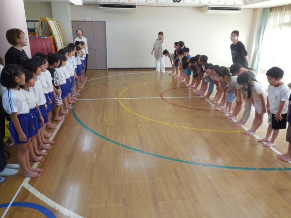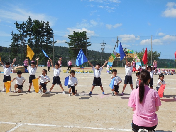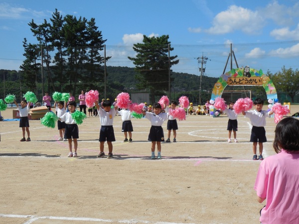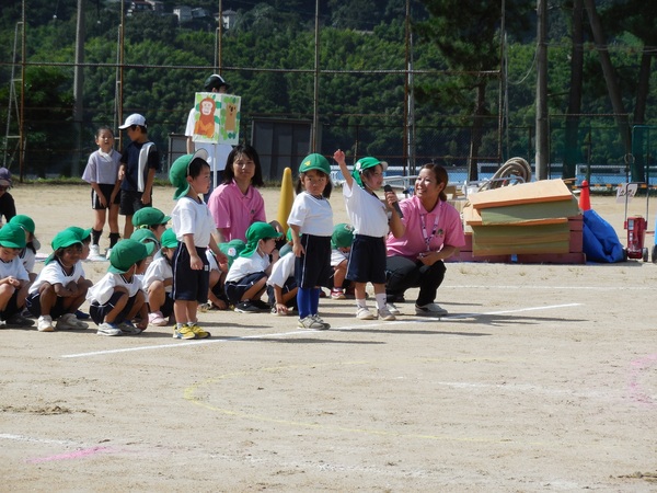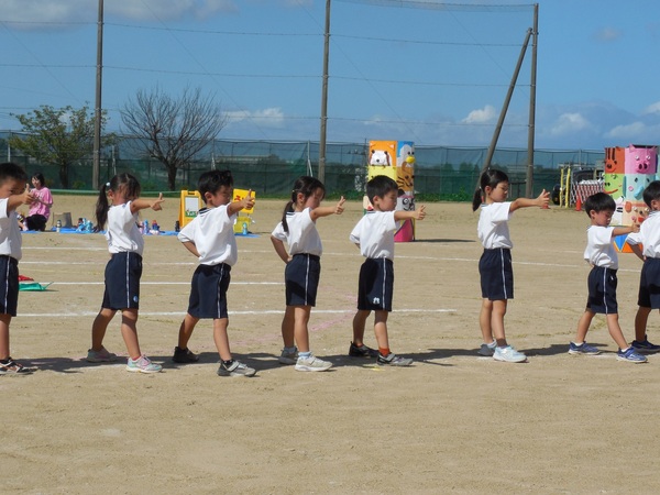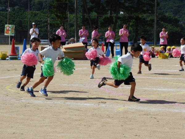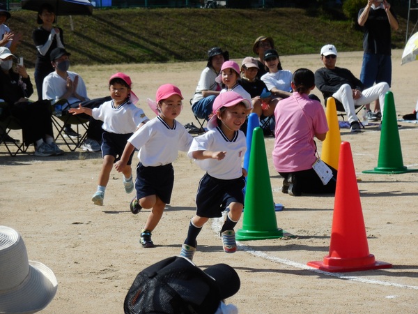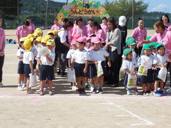 プログラム7番うめ組さんのかけっこ。一人ひとり大きな声で返事をして「よ〜いドン!」ゴールに待つ先生めざして、力いっぱい走りました。ゴールした時の子どもたちはとってもいい表情をしていました。続いて、ふじ組さんのダンス。テンポの速い曲ですがみんなで揃えて元気にダンスしました。ポンポンも力強く振られ「最強のダンス」となり、たくさんの元気をもらいました。最後は、まつ組さんのリレー。最後まであきらめずに全力で走り友だちにバトンをつなぐまつ組さん。差がどんどん縮まりハラハラドキドキの白熱のレース。「がんばれ、もう少し、追いかけて」と応援に夢中になり写真を撮るのを忘れてしまいました。運動会の最後に素晴らしい走りを見せてくれたまつ組さん素敵でした。全種目が終了し、父母の会からのご褒美をもらい満足そうな子どもたちでした。