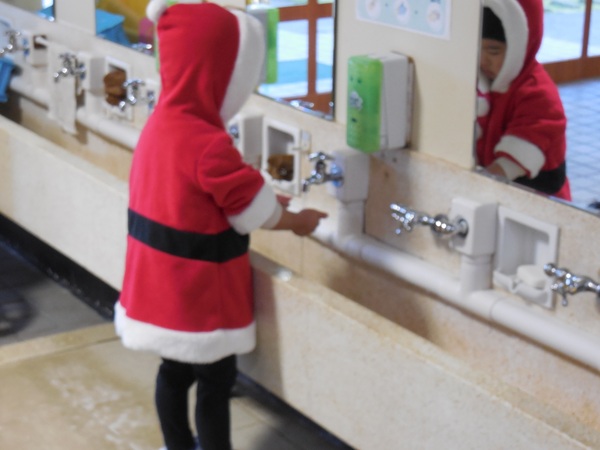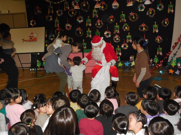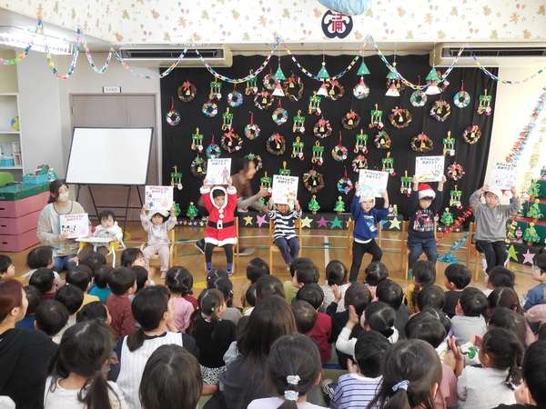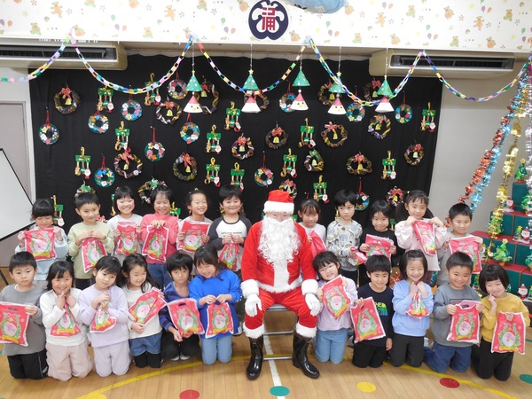 クリスマス誕生会 クリスマス誕生会。朝からわくわくでサンタさんのお洋服を着てくる子も。12月生まれの7名のお友だちをお祝いした後は、「サンタさんまだかなあ」と遊戯室のカーテンが空くたびにさっと振り向く子どもたち。そして、いよいよサンタさんの登場。「来たあ!」と大喜び。一人ひとり手渡しでプレゼントをもらい、「ありがとう」とにっこにこ。園でのクリスマス会が最後のまつ組さんがサンタさんと記念写真を撮って楽しい会は終わりました。サンタさん遠い所わくなみこども園に来てくださりありがとうございました。来年も待っています♪。 2025/12/24