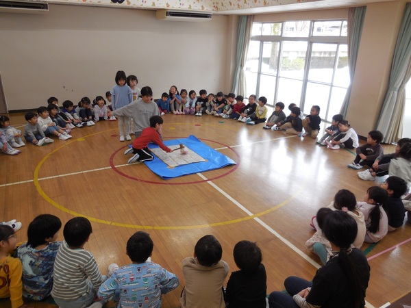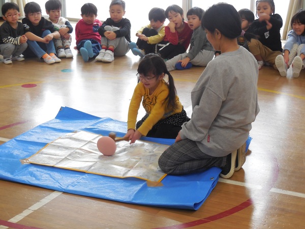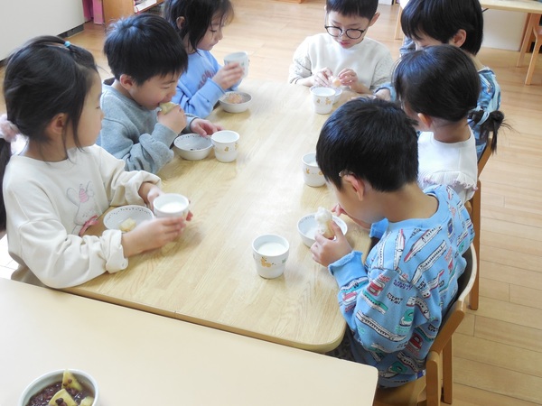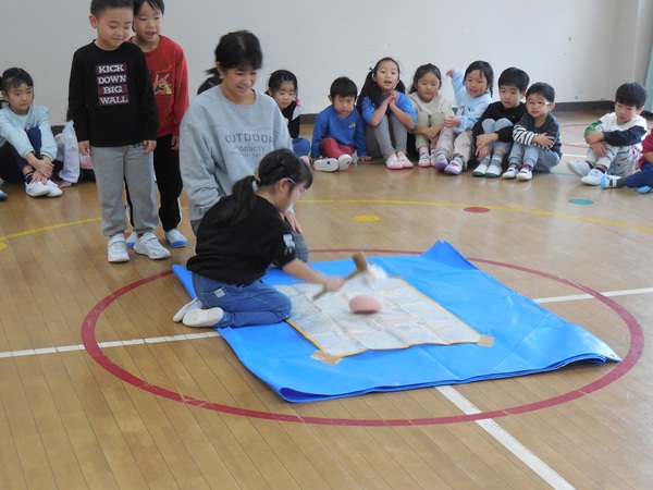 鏡開き 今日はわくなみ鏡開き。「とんとんとん、とんとんとん」みんなで正月に飾られた鏡餅を木槌でたたきました。なかなか開かず、大丈夫かなと心配そうに見守る子どもたち。最後は先生方の登場。ぎゅっと力を込めてやっとこさ開きました。開いた鏡餅はかきもちに。わくなみっ子や職員の皆さん、家族の皆さんの無病息災を願ってまつ組さんが代表して食べてくれました。「しおしおしている、おいしいね」と嬉しそうなまつ組さん。皆さん、健康で元気な1年にしましょうね。 2026/01/09