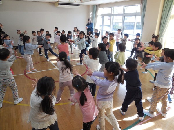 1月集会 今日は、1月の集会。おせち料理や春の七草等のお話しを聞き、最後に今月のダンス。「だるまさんがおどった」では「はめはめはあ」がビシッときまりかっこよかったです。ふと外を見ると、太陽の温かさに誘われて、もも組さんやひよこ組さんが外遊び。その後もたくさんのクラスが外での活動を楽しんでいました。わくなみっ子のみんな、寒さに負けず元気に2026年のスタートを切っていますね。 2026/01/07