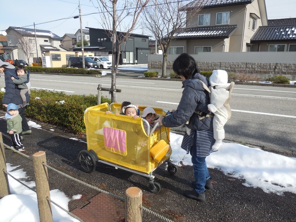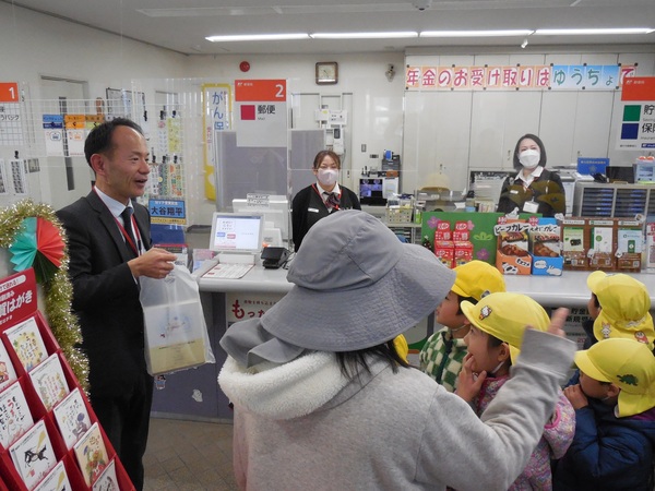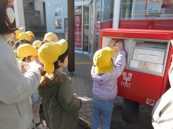 郵便局へレッツゴー! 今日も良いお天気、まつ組さんは年賀状を出しに郵便局へ。「ぽすくまだあ」「あれお金おろす機械だあ」と興味津々の子どもたち。見学後、一人ひとり手作り年賀状をポストの中へ。もらった家族の皆さんは、ほっこり温かい気持ちになるだろうなあ。郵便局の皆さん、年末のお忙しい中、見学させていただき、ありがとうございました。 2025/12/19