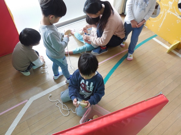 ボール遊び うさぎ組さんは広い遊戯室でのボール遊び。ひとり1個、大きなボールを持ちながら、無邪気に遊ぶ子どもたち。大事そうに抱えて走ったり、転がしたりする子。輪っかに入れたり、足に挟んだり。上手にボールと遊んでいる子もいれば、遊ばれている子も。経験初期の子どもたちの姿はとっても可愛いですね。 2025/12/12